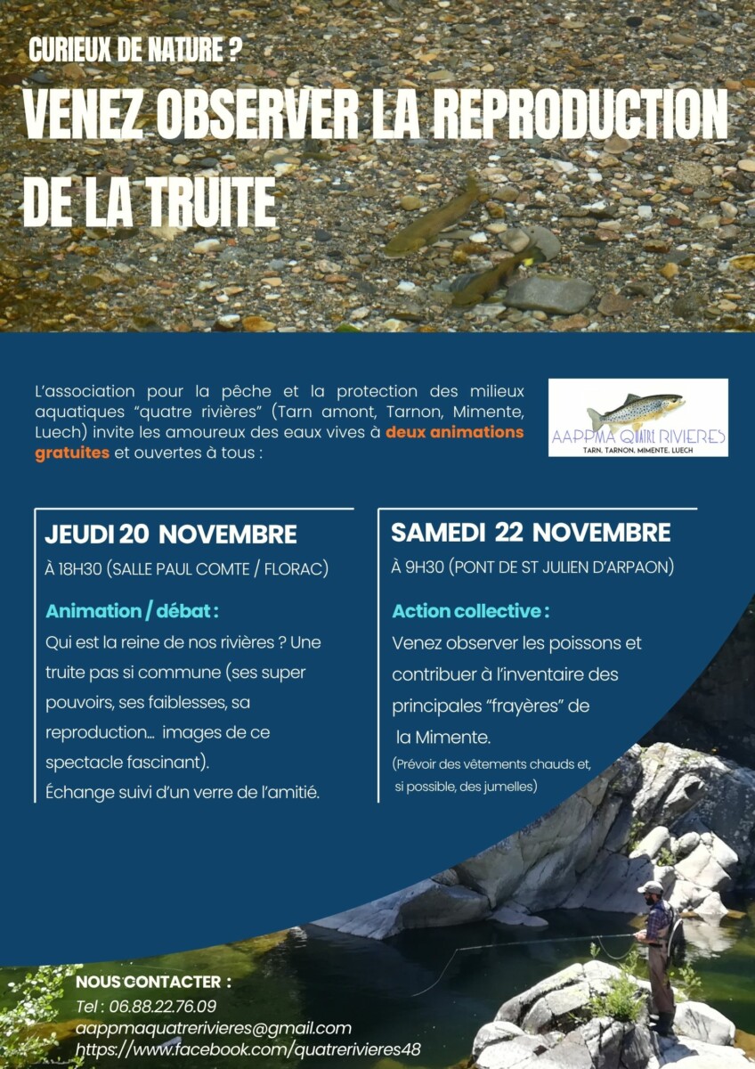 - le JEUDI 20 NOVEMBRE, à 18H30 (Salle Paul Comte à Florac) : une animation diaporama/vidéo, un échange sur la vie secrète de la Truite, suivis d’un verre de l’amitié ;
